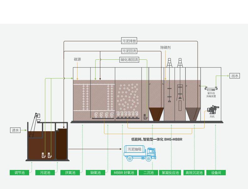 相較傳統(tǒng)污水處理工藝的同類污水處理設(shè)備,BME-MBBR一體化污水處理設(shè)備污泥產(chǎn)泥量能減少20%~30%。